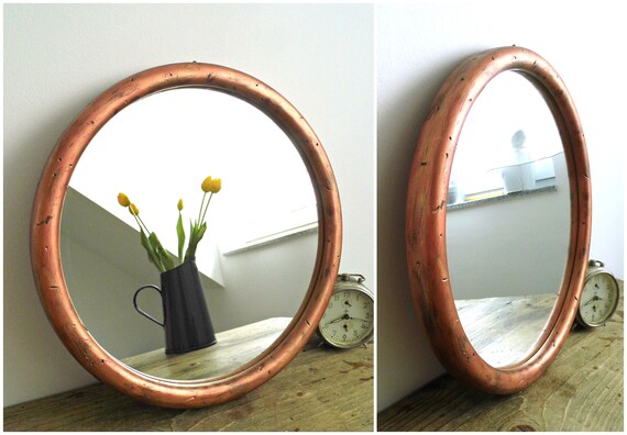 Vintage Round Wall Wood Mirror Copper Gold Tone Mid Century Vanity Bedroom Entryway Framed Painted Wooden Mirror Retro Wall Hanging Decor