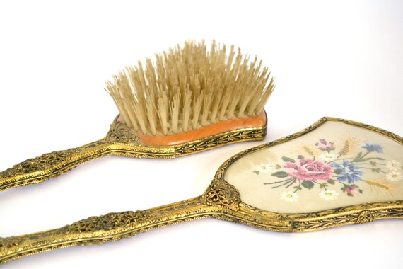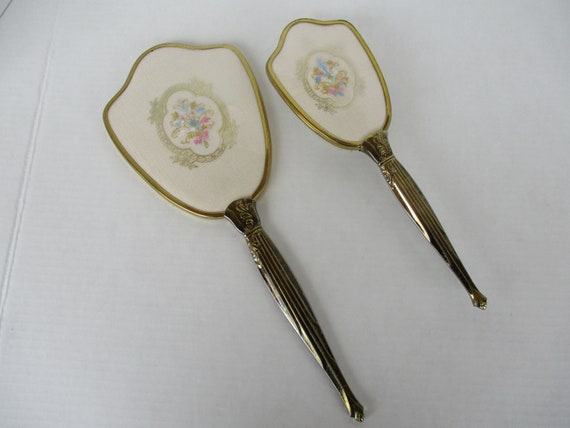 Details About Vintage Vanity Brush And Mirror Set With Needle Point Like Design With Flowers