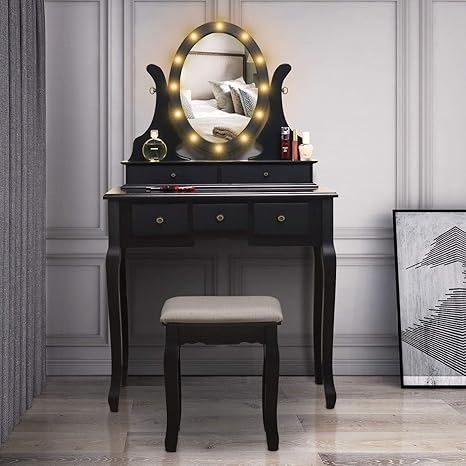Maismoda Vanity Table Set With 10 Led Lights 5 Drawers Makeup Dressing Desk With Cushioned Stool Set Black